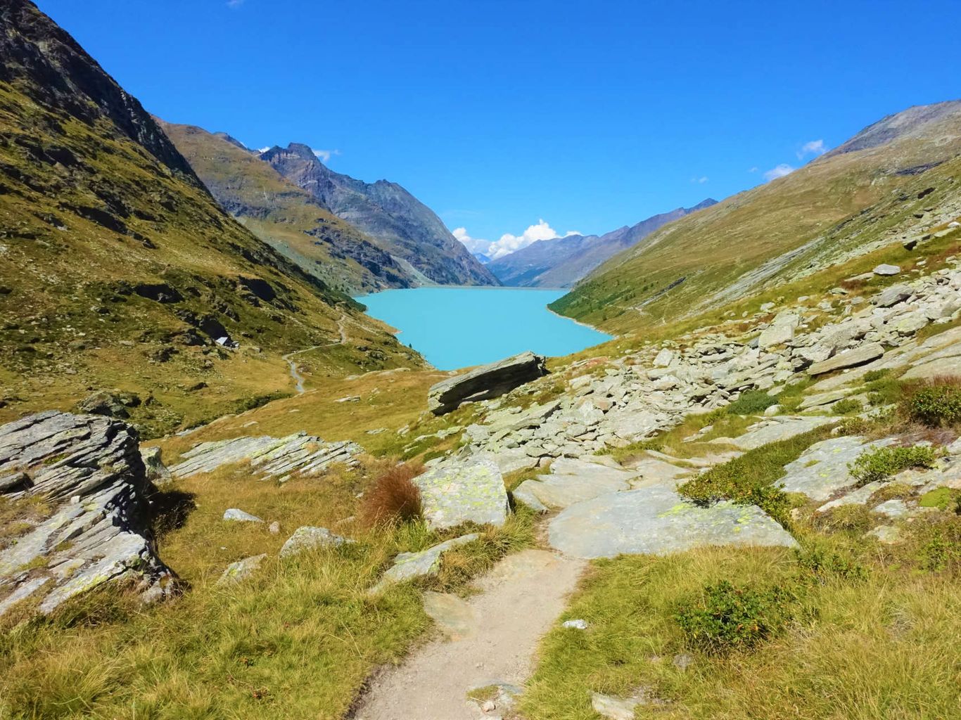 Dieser Tag wird lang und führt in hochalpines Gelände über 3000 Meter. Mit Postbus oder privaten Pkw fahren wir zum Mattmark-Staudamm, unserem heutigen Startpunkt. Nach einem Stück am See entlang, steigen wir hoch ins einsame Ofental. Dort werden wir beim Bergwandern vom Pfeifen der Murmeltiere begleitet. Es geht hinauf zur Jazzilücke, welche mit 3081 Metern den höchsten Punkt unserer Tourenwoche darstellt und einen fantastischen Blick nach Italien bieten kann. Von diesem Pass nun weiter über schmale Pfade durch die steile Bergflanke und hinab zum Antronapass (2838 m), der schon in der Zeit der alten Römer als Handelsweg genutzt wurde. Der lange Abstieg nach Saas Almagell erfolgt durch das ruhige Furggtälli.